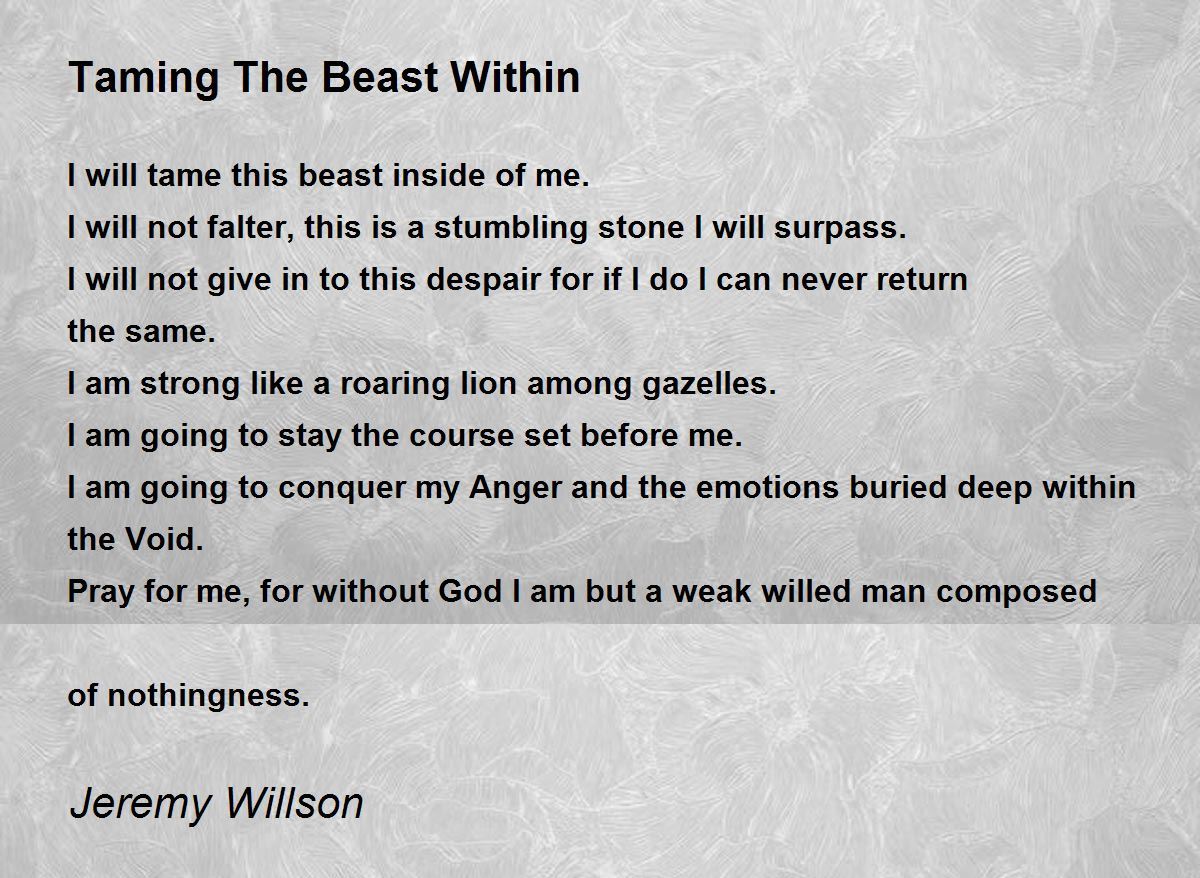Taming the beast quotes. Like the way men could say one thing then another then act in a way inconsistent with both positions and somehow still be convinced of their own integrity. Explore Emily Maguire Taming the Beast quotes images. -Charles Manson Stone souls prowling the neighborhoods out on the town for a bloodbath.